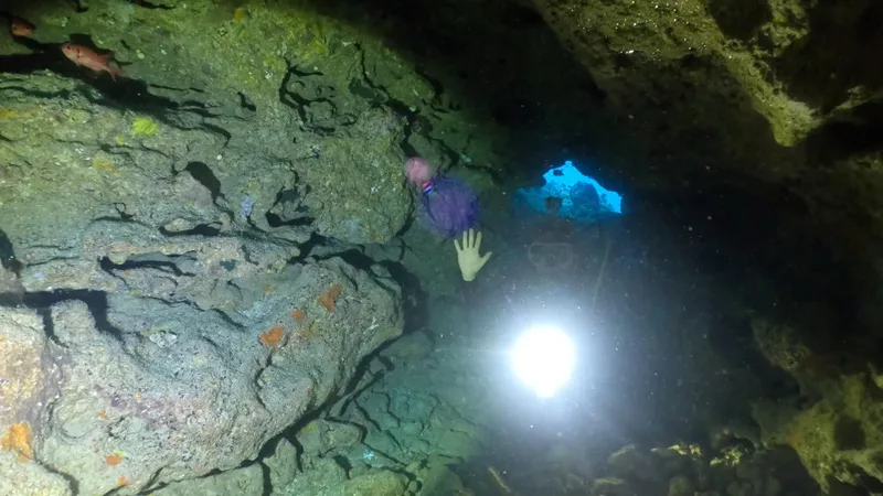 目指すのは万座ドリームホール。与えられた本数は午前の2本、回復具合は海に出てみないと?、ですがスキルは十分に確認しているのでそこは安心。他のグループもいるので万座ドリームホールエントリーのミニドリーム戻りです。この朝の時間帯は波も20㎝程度、非常に安定感があり透明度抜群。地形内部も誰も入っていないので水がクリアです♪。こんなにきれいな水のドリームホールは久しぶりに入ったかな(笑)