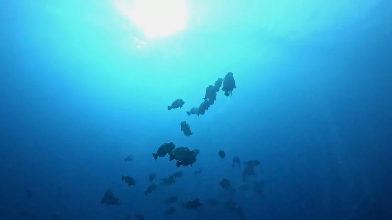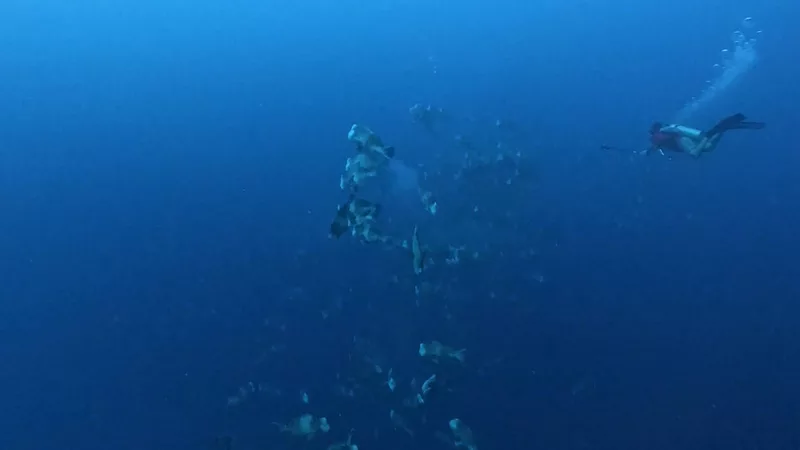5:45出発です。まぁ沖縄のこの季節の粟国遠征を考えればまぁ似たようなもんですが、西のウーロンエリアなので1時間掛からず着きます。ボートが苦手な人もチャレンジOK。少しずつボトムから集まり始めるカンムリブダイ、んで、突然密集し始め体を寄せて舞い上がります、こんな感じ。一般的にこの類のスタイルは浅瀬で見る感じですよね。