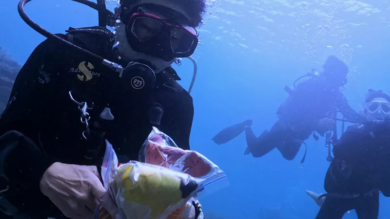 さて、ジップロックを用意して持ち込み。いつもはどちらかと言えば固めの物ですが今回は柔らかいもの、空気抜いたら浅場に戻るときに開いて水没するかも・・・なんて思いながら潜ってみましたが。