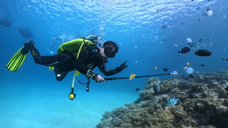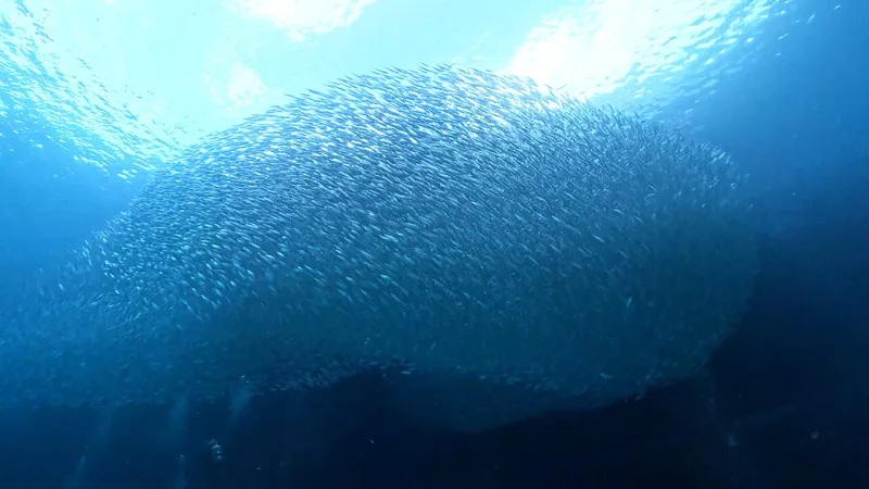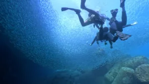 外国のゲストダイバーさんです。数日前に一緒にボートに乗り合わせた方ですが、”空いてるなら崎本部のガイドをお願い”ということで再会、そしてご一緒することになりました。はい、スキルもGOOD、insta360が出てくるのではい、今日もイワシ祭りに参加です。水は比較的良いですが時間と共にダイバーが入り透明度が落ちてくるいつもの展開。