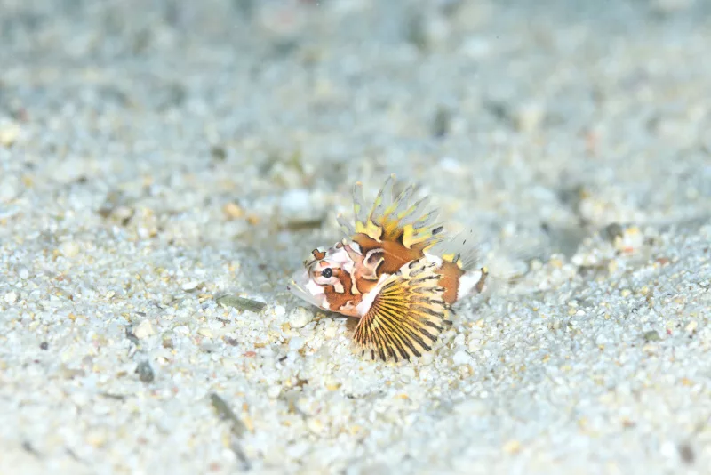 3便はクロスラインへ、この辺で実は私のドライ、ネックにダメージを受けてお色直ししてスタート。修理行きです、しばらくは違うドライで潜ります、はい。で、これが久しぶりの登場、ずいぶん前になかゆくいで見たカサゴ、どうやらこれ、オガサワラカサゴと言うらしい。当初はヒレボシミノカサゴじゃねーかと言われてるけど多分オガサワラカサゴらしい、まだ小さいからしばらく楽しめると良いね。