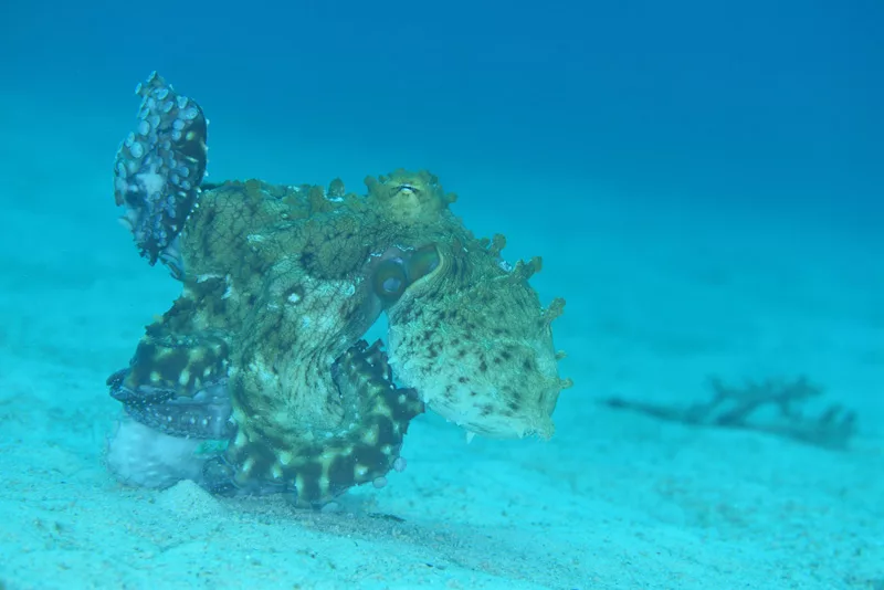 タコが躍る姿に遭遇・・・。これはなかなかコメントが難しいですが・・・まずタコって脱皮するってのが普通の人は知らんよね。撮ったり食べたりはするけどね。どうやらタコはいろんな所に吸盤でくっつく為に酷使してる吸盤の性能を保持するために吸盤のばっぴを頻繁に行うらしい。これ、多分それの前段階じゃないのかな。その昔、尋常でない数の黒いものを周りにいっぱい落としてたのも見たことあるけどこれも前段階なのかな、なんて思いながら見てました。このままグリングリンを続ける訳です。これも海の不思議よね。