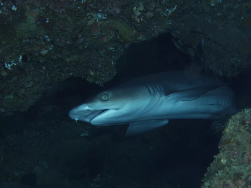 ホワイトチップシャークが最近はあまり行かないクレバスに帰って来てるらしい。見たい人には良い傾向です。コダマタツも3個体見えたそうです。私のチームは反対向きのホテルエッジ方面へ、ドロップオフを泳ぎながらちょっとエアーを確認です。・・・が、12Lタンクに変更してのスタートですがさすがに体が大きいので減る減る、ビュンビュンです。